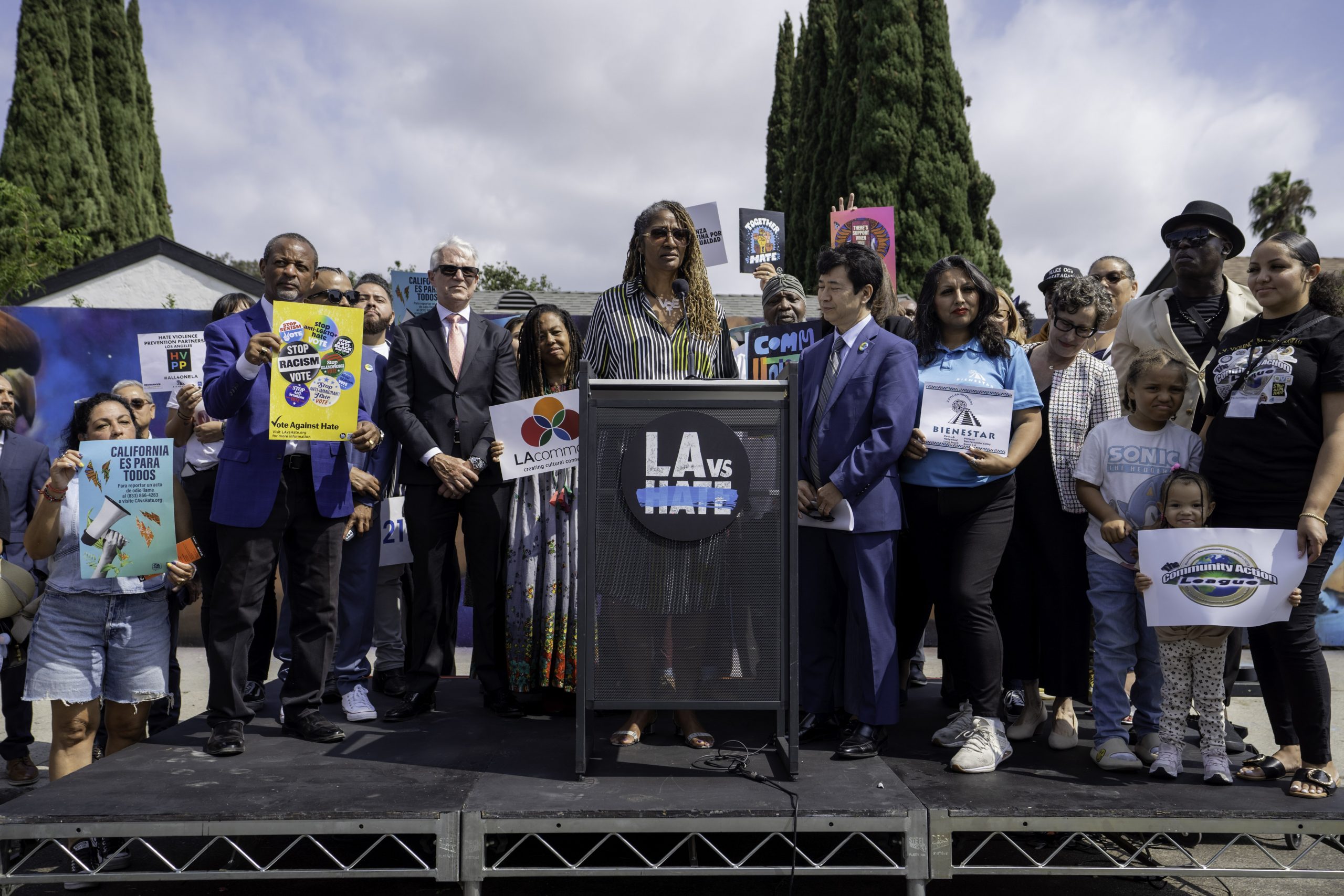 LA vs Hate held a press conference Friday under the “Unity Under the Sun” mural in Watts to launch the seventh annual “United Against Hate Week” in Los Angeles County.