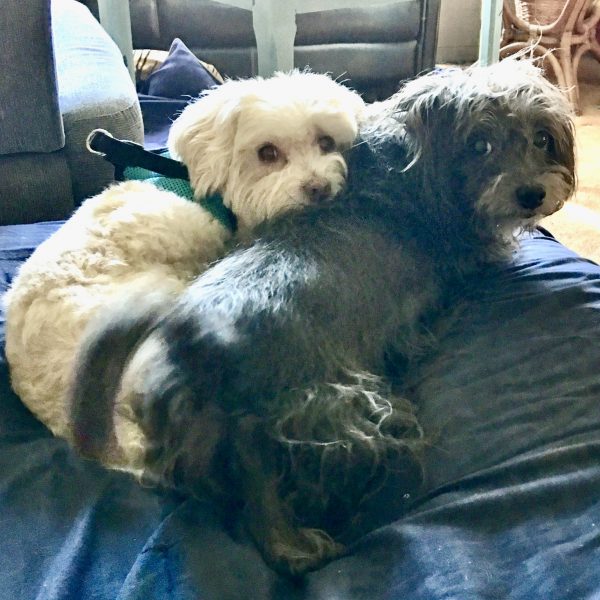 Not long after, my friend Gloria Nieto called to see if I would be interested in adopting this little boy dog who needed a new home asap. Gloria lived in the Santa Cruz area, so we decided to meet halfway in San Luis Obispo to see if the two dogs got along. They did, Papa D came home with us, and I became friends with Papa D’s heartbroken mom on Facebook.