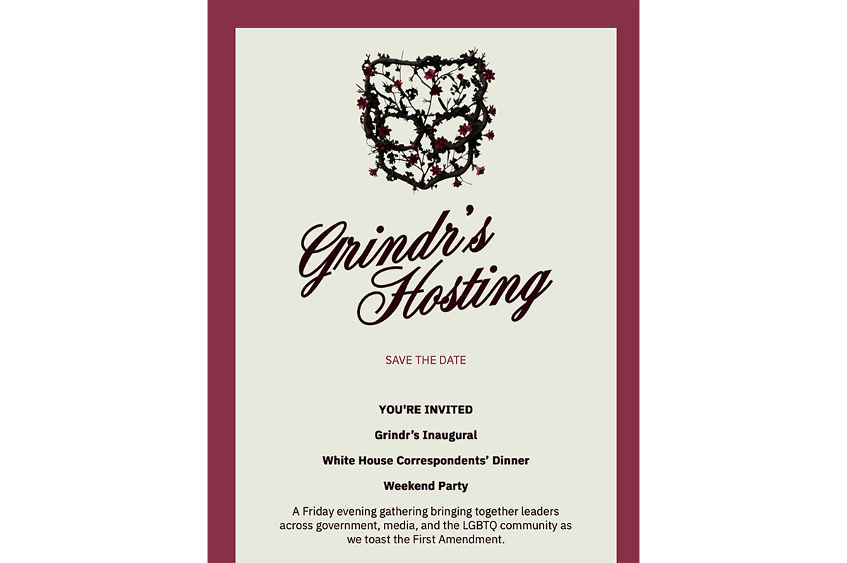 “We’d be thrilled to have you join us at Grindr’s inaugural White House Correspondents’ Dinner Weekend Party, a Friday evening gathering to bring together policymakers, journalists, and LGBTQ community leaders as we toast the First Amendment.”
