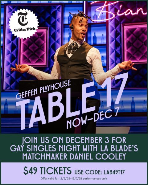 Table 17 plays at the Geffen Playhouse, 10886 Le Conte Avenue, Los Angeles, CA 90024, until December 7. Use code: LAB49T17 for $49 (includes per ticket fee) for Premium, Section A or Section B seating. No ticket limit. No refunds or ticket exchanges. Visit geffenplayhouse.org to purchase your tickets. Code also valid for performances Dec.4-7, including weekend matinees.