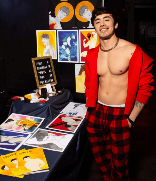 As an artist, it’s also such a great way to get my art to queer shoppers. I love meeting fans of my art! It’s becoming increasingly hard to sell queer art online, as platforms like Instagram and Etsy crack down on queer themed erotic art. I just had my Etsy store shut down because they said my gay Christmas cards broke their rules, and I’m currently on my fourth Instagram account after all my previous accounts got shut down. That’s why my Instagram name is @instahatesgayart. I’m on Bluesky and Twitter as @gaydudesketches, but those platforms are less ideal for showing off art.”