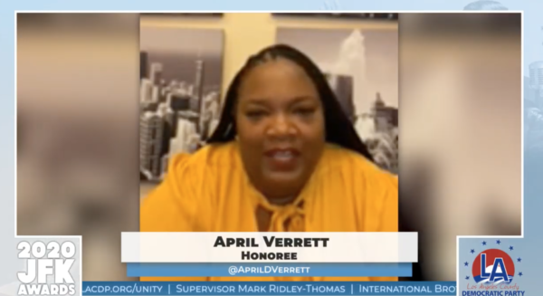 April Verrett, President of Service Employees International Union (SEIU), Local 2015 – the nation’s largest longterm care union representing 400,000 California home care and nursing home workers, was gushed over receiving the Kam Kuwata Partnership Award, named for the late veteran political consultant. The honor was particularly poignant since that Saturday afternoon the LA County Department of Public Health confirmed 3,628 new cases of COVID-19.