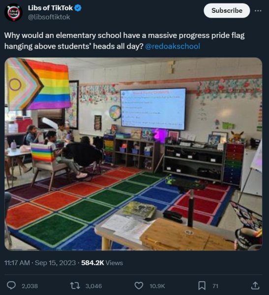 Such a post was made on September 15 by the account of the interior of a classroom at a Highland Park elementary school which featured a pride flag and general rainbow theme. Her post asked, “Why would an elementary school have a massive progress pride flag hanging above students heads all day?” to which her respondents replied by calling the teacher a groomer and pedophile.