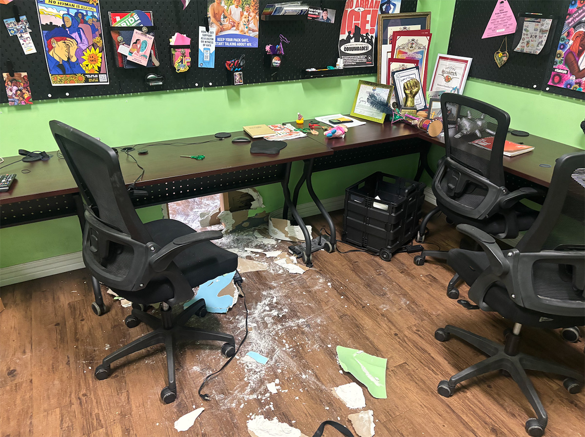 After stepping inside, the damage became clear. Pieces of walls were torn out and strewn across the floor, items were hastily tossed aside, and the technology normally utilized for the center’s phone banking program, fitness classes, and community workshops were missing. “This is our first space,” Perez told the Blade, noting how devastating this break-in has been, both physically and mentally, for himself and his community members.